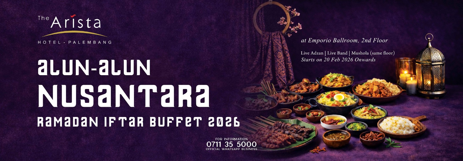 Tahun ini, The Arista Hotel Palembang mengangkat tajuk “Alun-Alun Nusantara”, sebuah konsep yang menonjolkan suasana berkumpul dengan penuh rasa suka cita di dalam area yang luas bersama keluarga dan rekan untuk menikmati sajian berbuka puasa. Dimulai dengan dekorasi spesial yang membuat suasana terasa anggun dan mewah, hingga kedai-kedai yang menyajikan aneka sajian khas Nusantara hingga menu mancanegara. Semua dikemas menjadi satu dalam suasana hangat kebersamaan yang menciptakan sebuah pengalaman berbuka puasa yang tak terlupakan.